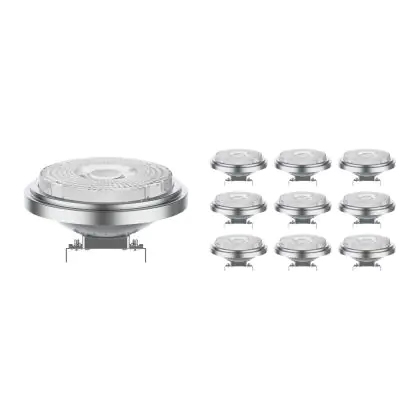 La Confezione Multipack 10x Noxion Faretti LED G53 AR111 7.4W 450lm 40D - 927 Bianco Molto Caldo | Miglior resa cromatica - Dimmerabile - Sostitutiva 50W è la perfetta sostituzione della classica lamapda alogena50W G53 con colore della luce 927 Bianco Molto Caldo. Questa lampadina ha una forma "Aluminium Reflector" (Spot) con diametro di 111mm e gli attacchi hanno una distanza di 53mm l’uno dall’altro. La lampada G53 è molto più sicura in ambienti umidi rispetto le lampade alogene a 230volt, le lampade G53 funzionano a 12V. Perciò c’è bisogno del trasformatore per avere un voltaggio di 12V. Puoi trovare i trasformatori adatti in "Accessori" su questa pagina prodotti. Di quale trasformatore hai bisogno, dipende dal numero di lampade che vuoi connettere. Il nostro servizio clienti puoi aiutarti con la scelta. Passare a LED ti offrirà tanti vantaggi!