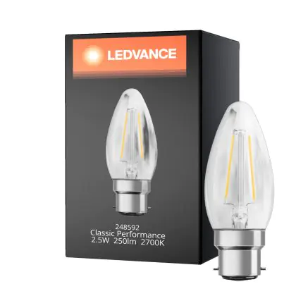La Ledvance Classic Performance LED Bulbo B22d Candela Filamento Chiara 2.5W 250lm - 827 Bianco Molto Caldo | Sostitutiva 25W è la sostituzione perfetta per la tua lampada convenzionale 25W B22d. Sostituire con il LED ti offrirà molti vantaggi.