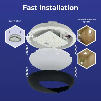 Prima di sostituire un vecchio apparecchio di illuminazione con uno nuovo è sempre consigliabile controllare le dimensioni. Installare questa plafoniera LED è molto facile: basta leggere attentamente le istruzioni e utilizzare il materiale di installazione fornito (viti, tasselli, ecc.). Se hai dubbi sull’installazione consulta un installatore certificato. Per questa lampada offriamo una garanzia di 5 anni.